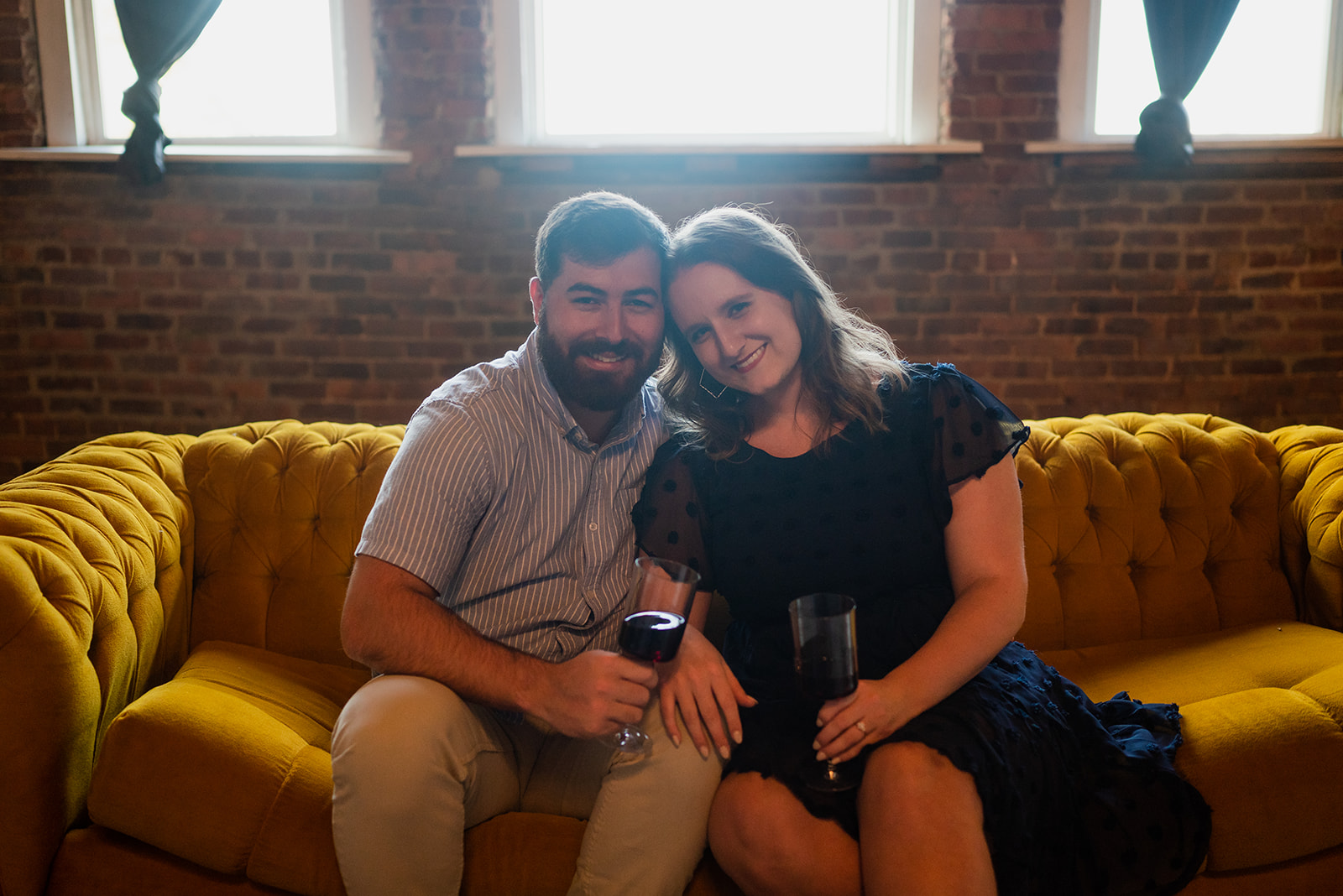 A smiling couple sits close together on a mustard yellow tufted sofa, holding drinks and looking happy.