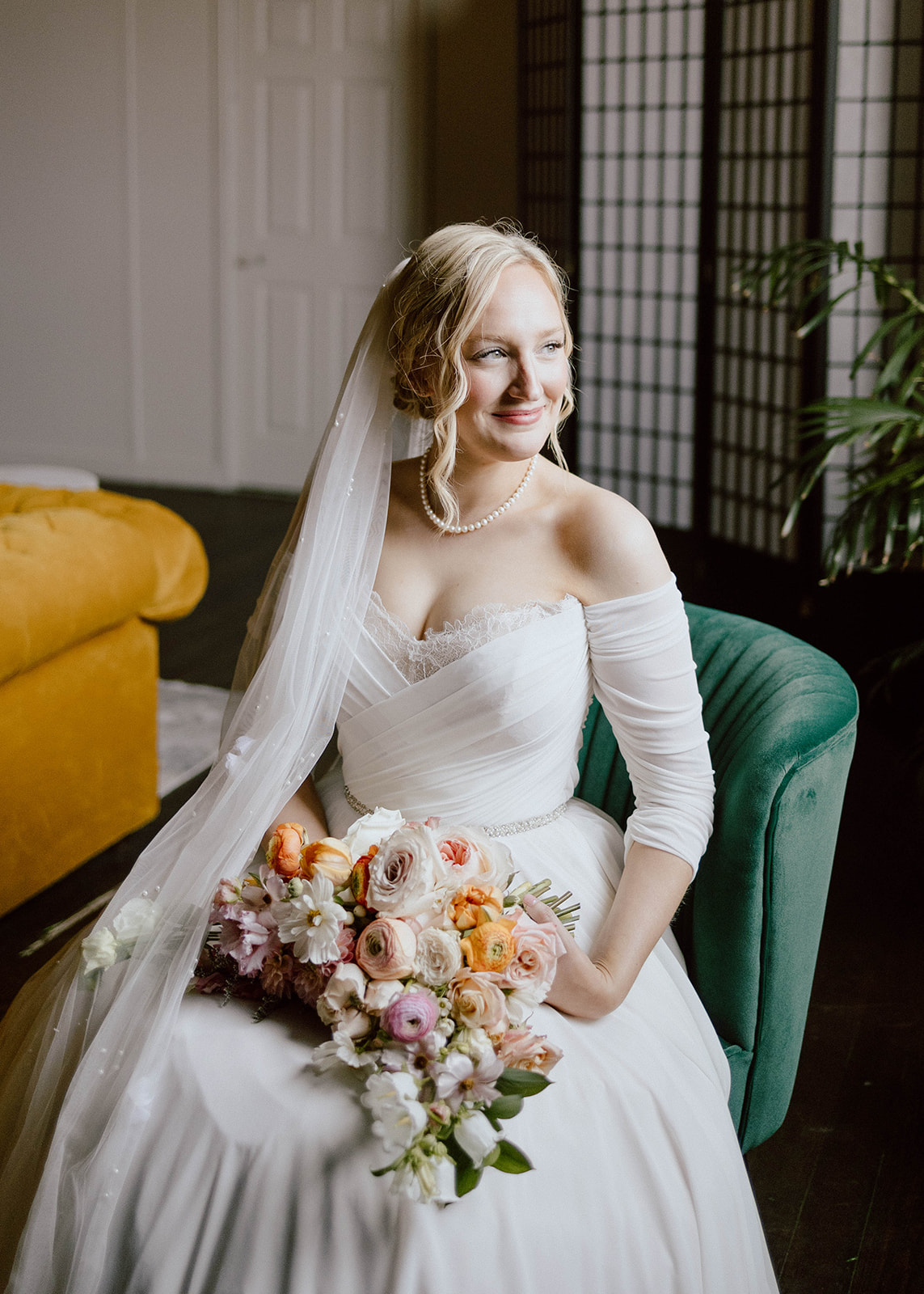 A bride in an off-the-shoulder gown and pearl necklace sits in a green chair holding a vibrant pastel bouquet, smiling softly as natural light illuminates her face.
