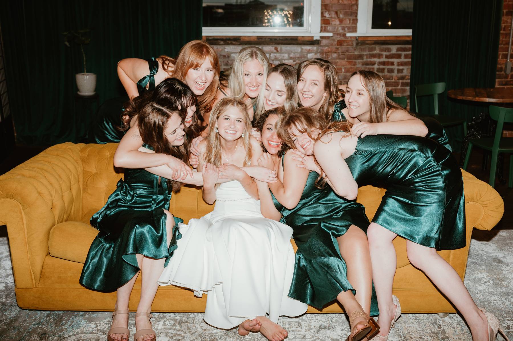A joyful bride in a white gown sits on a mustard-yellow couch surrounded by her bridesmaids in green dresses, all hugging her with big smiles.